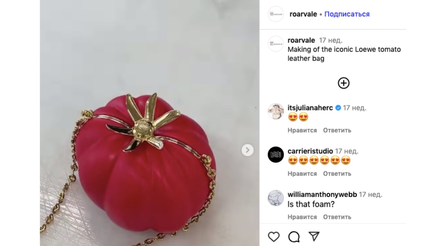 Loewe перетворив вірусний мем на культовий клатч Tomato Clutch – гіперреалістичну шкіряну сумку із золотистим стеблом, яка коштує майже 4 000 доларів.